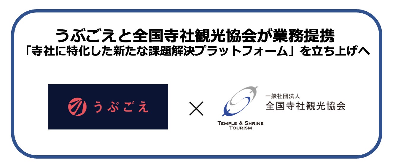うぶごえ株式会社(本社:東京都渋谷区、代表:岡田一男)は、2022年11月30日(水)より、寺社向け情報誌およびWEBメディア「寺社 Now」を運営する一般社団法人全国寺社観光協会(本部事務局:大阪府大阪市、以下全国寺社観光協会)と業務提携を締結しました。本提携を通じて、寺社と地域社会の課題解決と文化の持続的な発展に寄与してまいります。